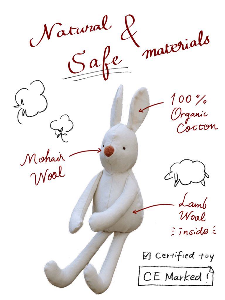 The fabric is 100% organic cotton and the stuffing is 100% natural lamb wool. We source good quality, certified materials from Europe. Although the stuffing wool has been thoroughly washed, there is a remaining hint of natural wool scent, which may provide children with more comfort and affection.